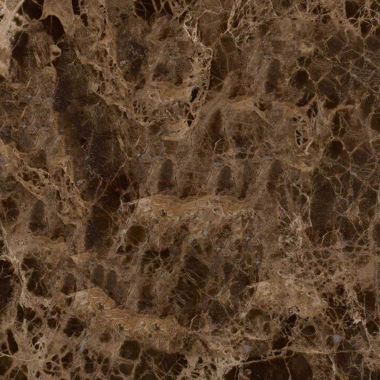 Dark Emperador is a high-density, brecciated brown marble quarried primarily in Spain. It is characterized by its deep hazel/tobacco background interlaced with erratic light-colored calcite veins and occasional “spider-web” clusters.