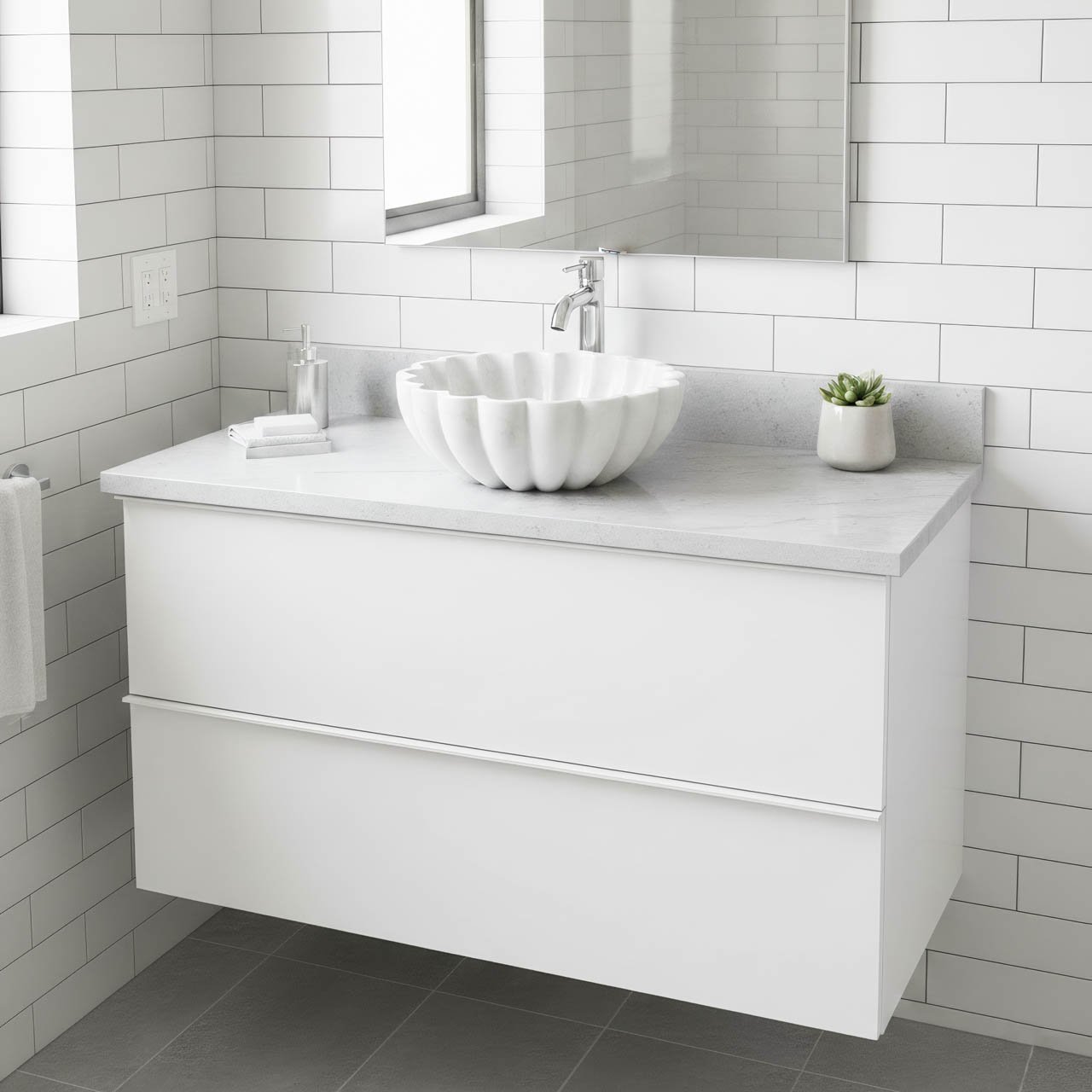 • Form Faktörü: Tezgah üstü lavabo olarak tasarlanan bu ürün, gömme yerine tezgah üstüne yerleştirilerek heykelsi zarafetini vurgular.