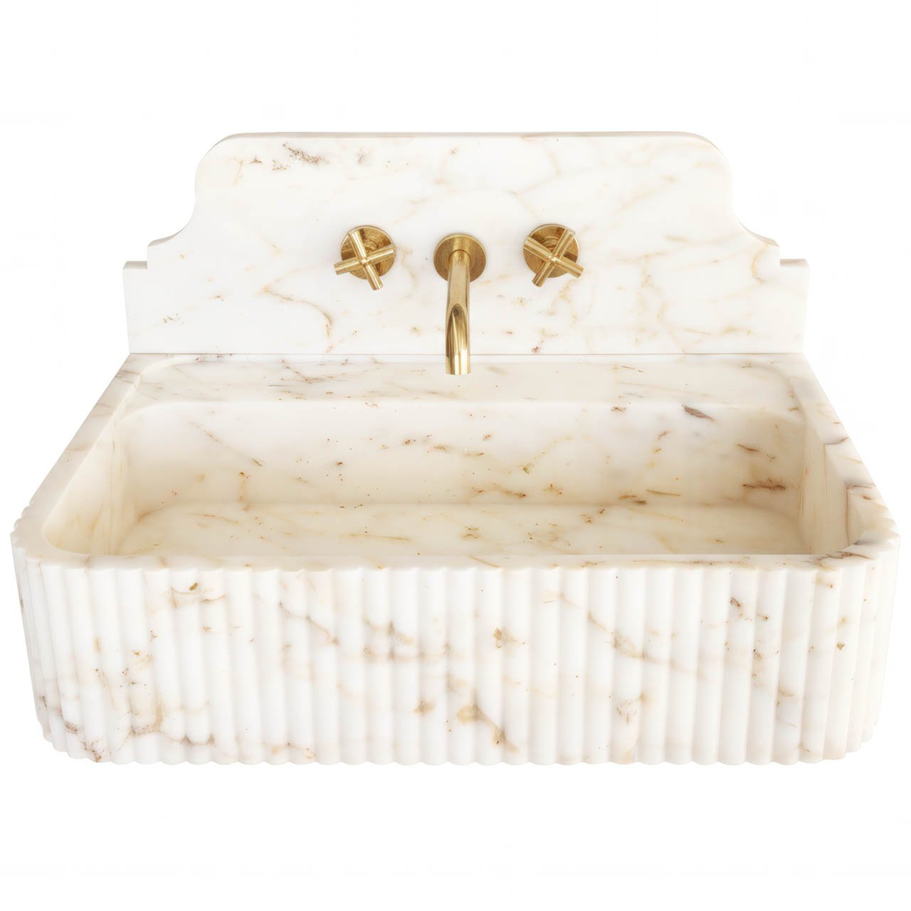 Integrated Backsplash: The sink features a high, wall-mounted backsplash with a stepped, architectural silhouette, reminiscent of Art Deco or neoclassical estates.
