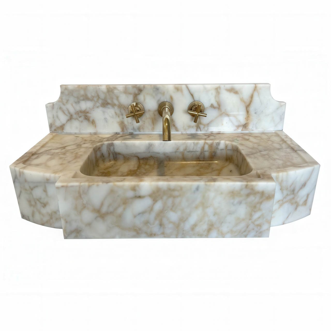 This natural marble sink is a masterclass in "Old World" luxury meeting modern craftsmanship. Carved from Aurelian Calacatta marble, it features a warm, creamy base with sophisticated golden and honey-toned veining.