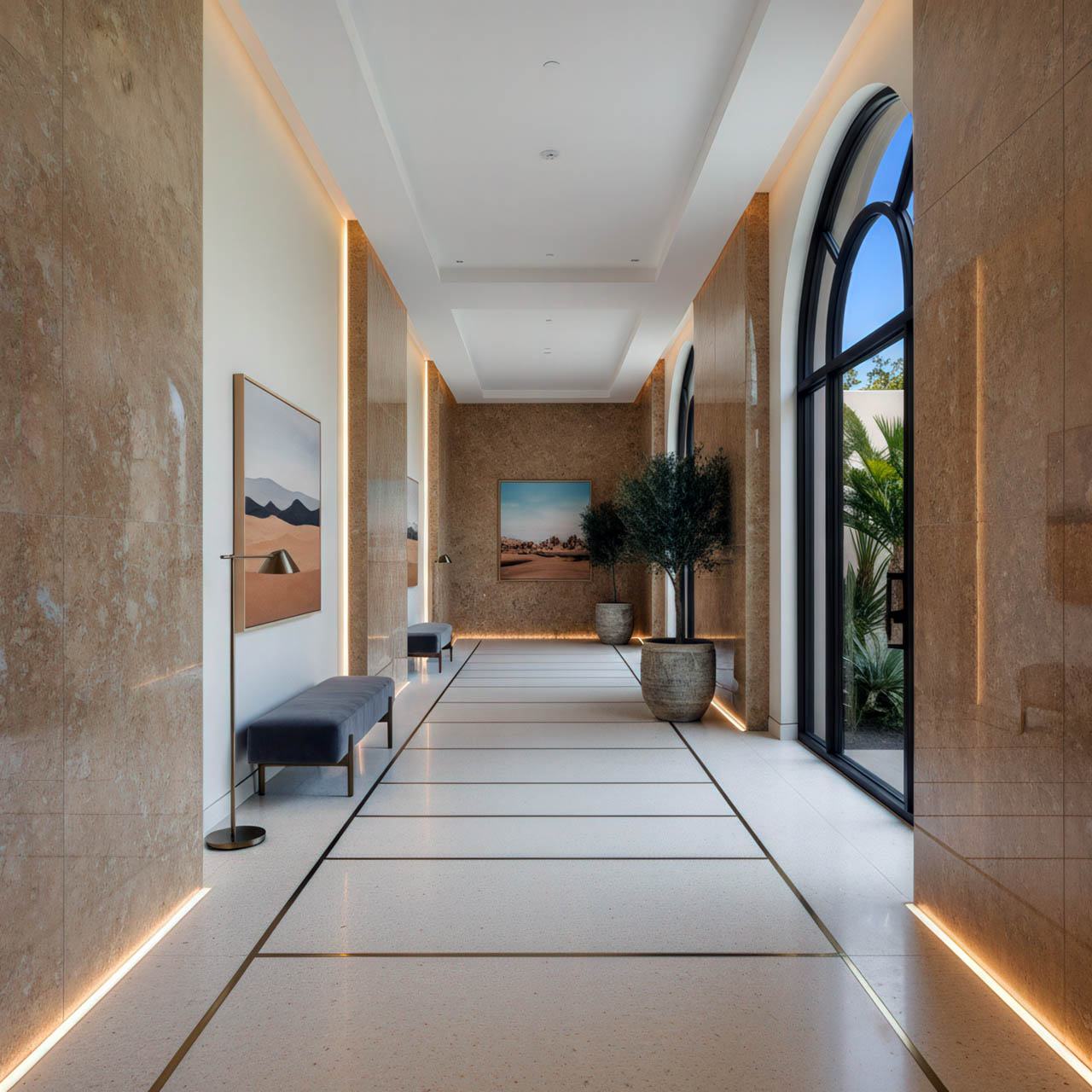 We are pushing the boundaries of natural stone application with our specialized Architectural & Furniture Solutions. By utilizing advanced engineering, we produce ultra-thin Noche Travertine veneers designed for high-performance cladding: