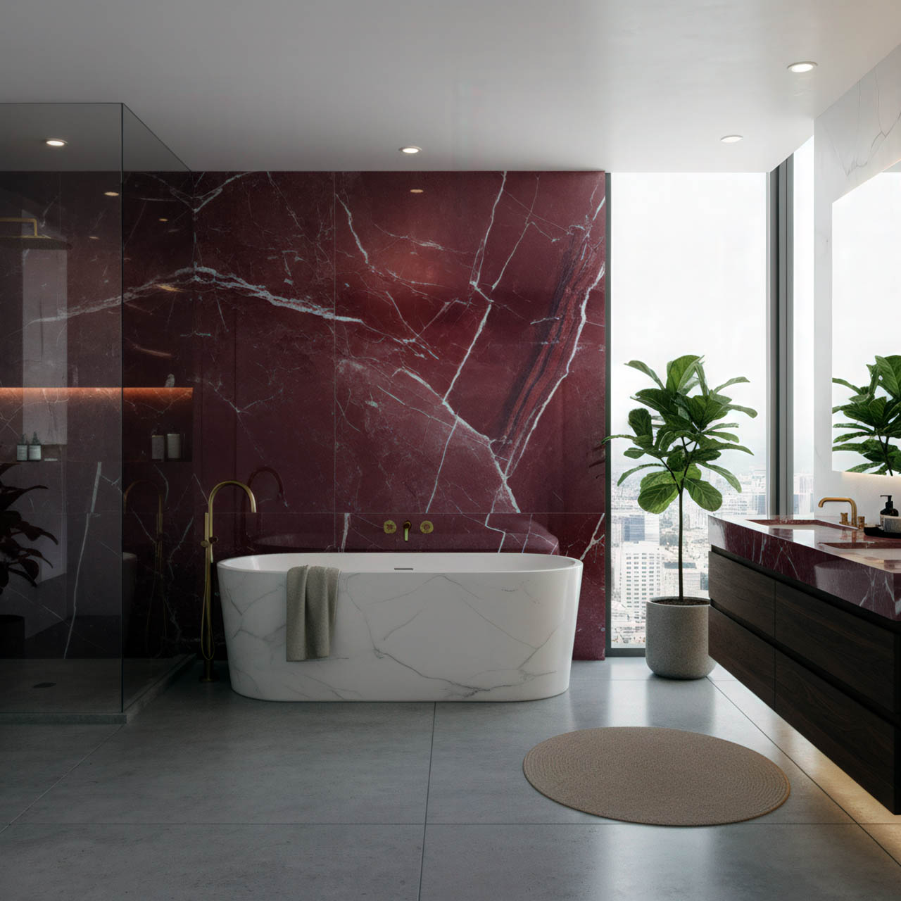 In addition to traditional slabs, we specialize in high-tech architectural solutions that push the boundaries of stone application. Our Ultralight Rosso Laguna panels allow you to bring the luxury of marble to spaces where weight was previously a constraint.