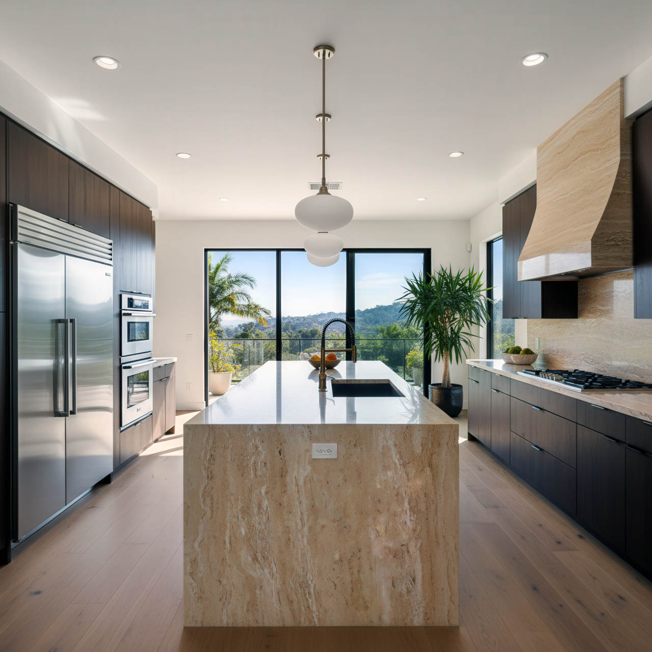 Floating Hearths: Long, thick slabs of Medium Travertine are used to create cantilevered hearths that act as both a fire safety feature and a sculptural seating element.