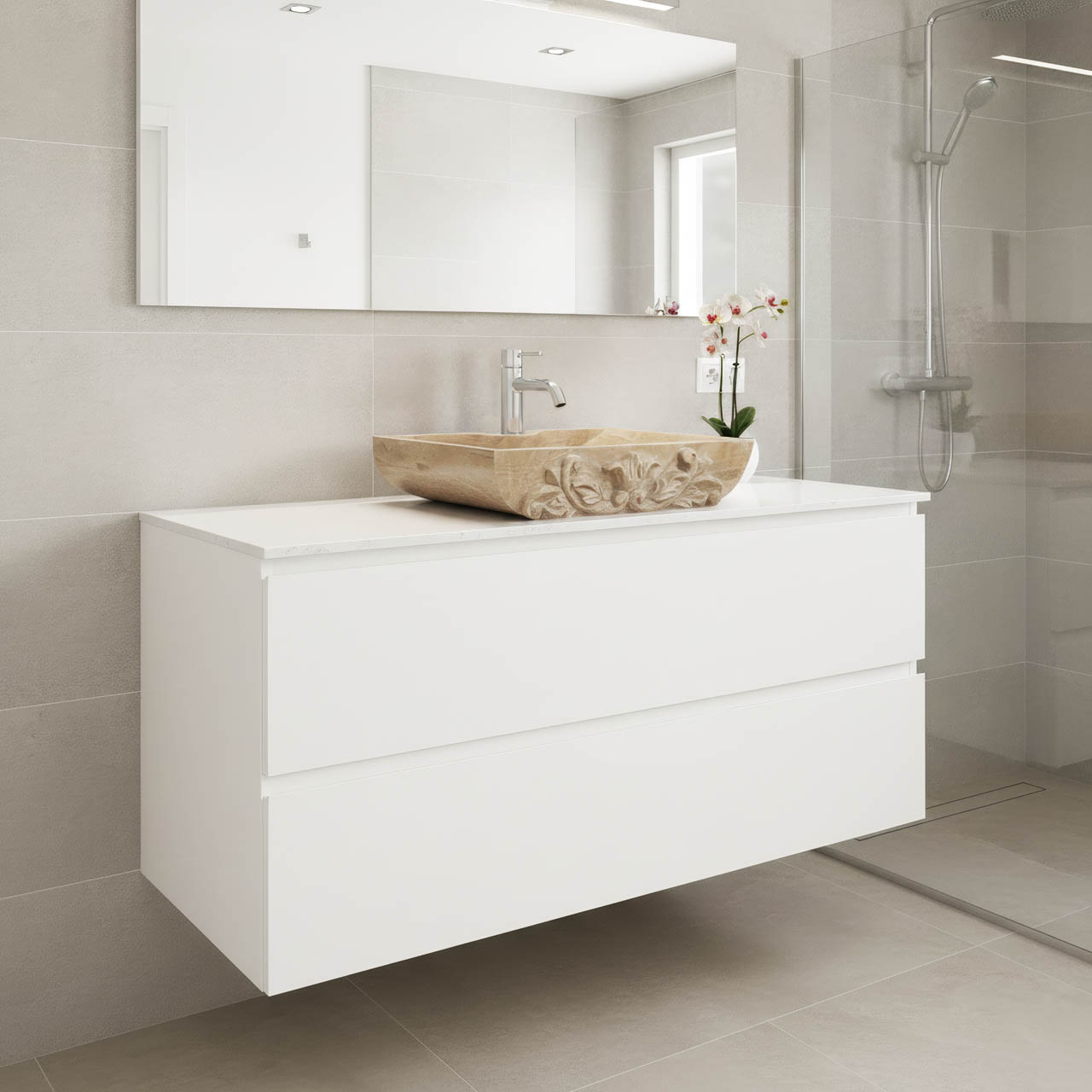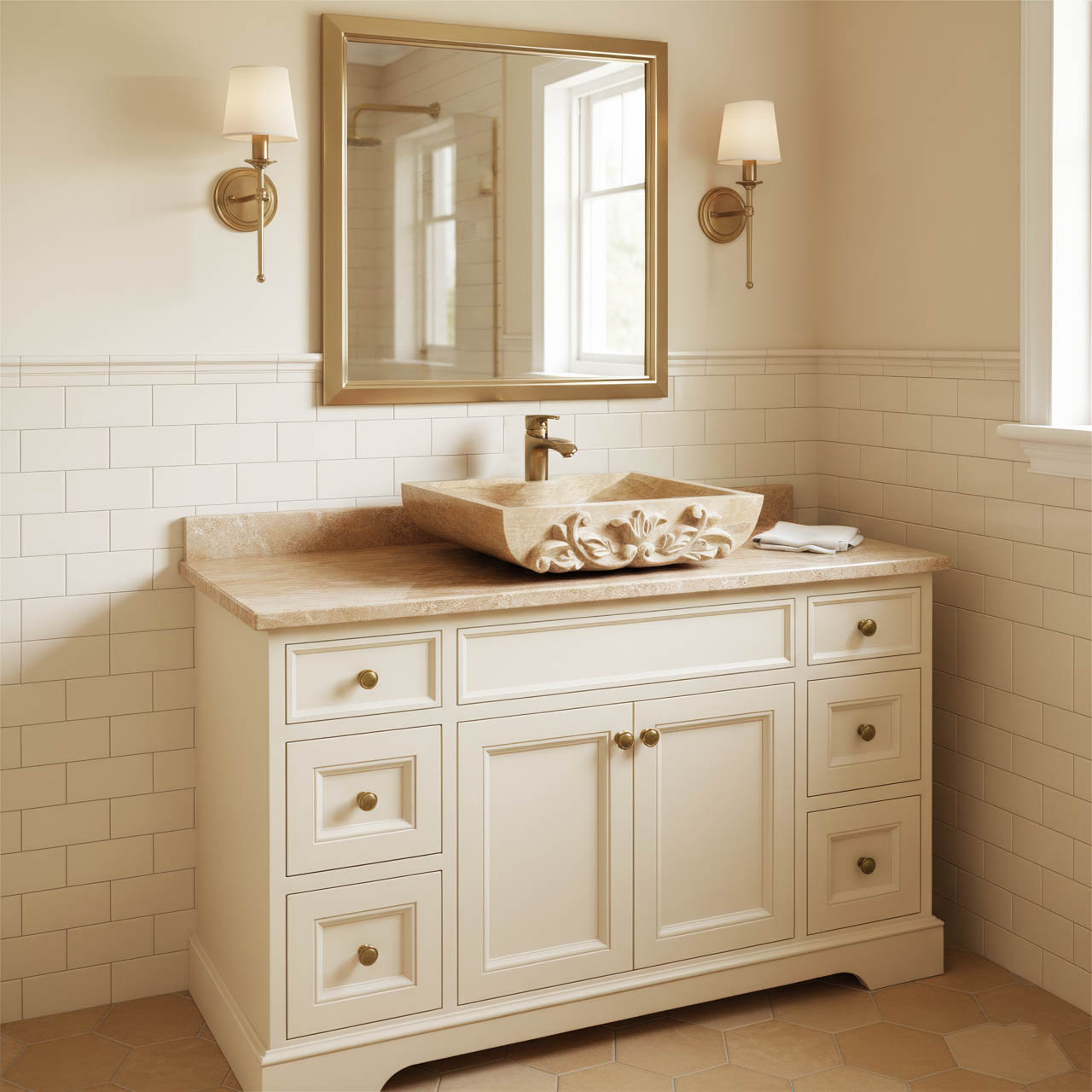 Çok Yönlülük: “Klasik” veya “Rustik Lüks” bir estetiği temsil etme eğiliminde olsa da, nötr bej renk şeması, Akdeniz ambiyansı için ahşap banyo dolaplarıyla veya çarpıcı bir kontrast için koyu taş tezgahlarla güzel bir şekilde uyum sağlamasına olanak tanır.