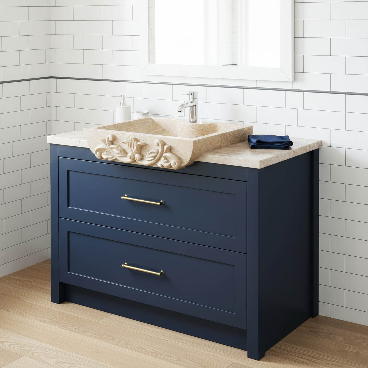 Kurulum: Bu lavabo, tezgah üstü monte edilen (tezgah üstü) bir lavabo olarak tasarlanmıştır ve karmaşık ön oyma detaylarını vurgular.