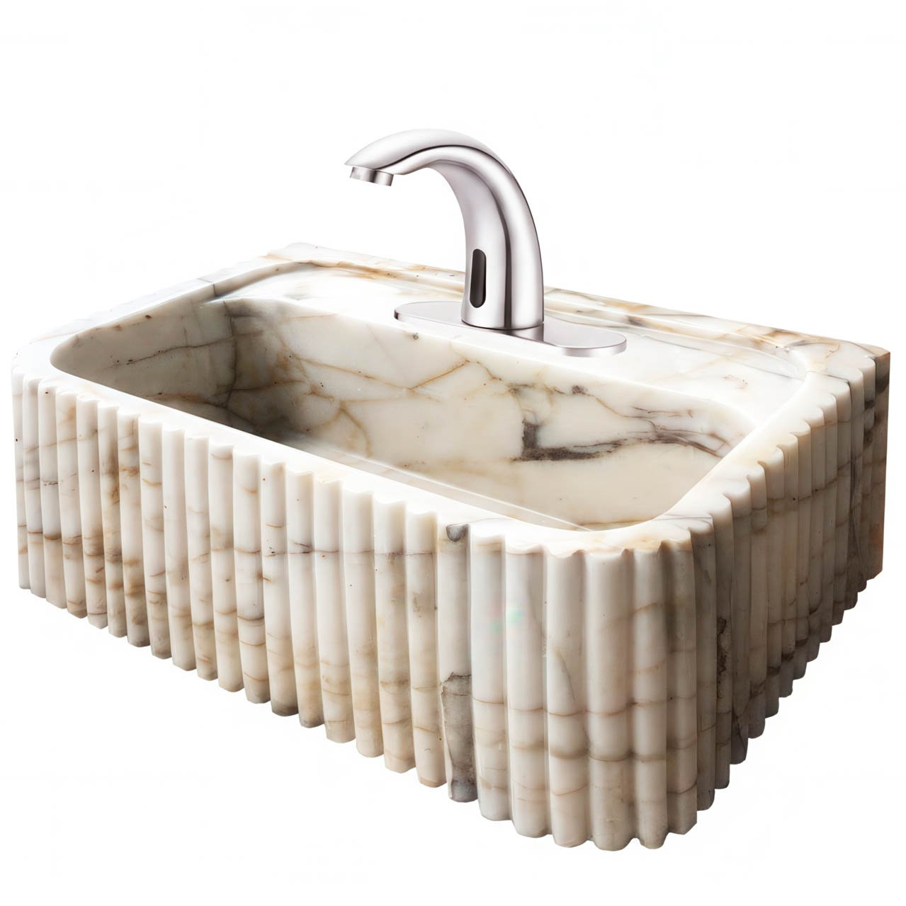 The Severus model is characterized by its fluted (ribbed) exterior, a design trend that adds depth and tactile interest to bathroom spaces. Carved from a single block of Calacatta Sugar Marble, it features the iconic creamy white background with warm, honey-toned and grey veining.