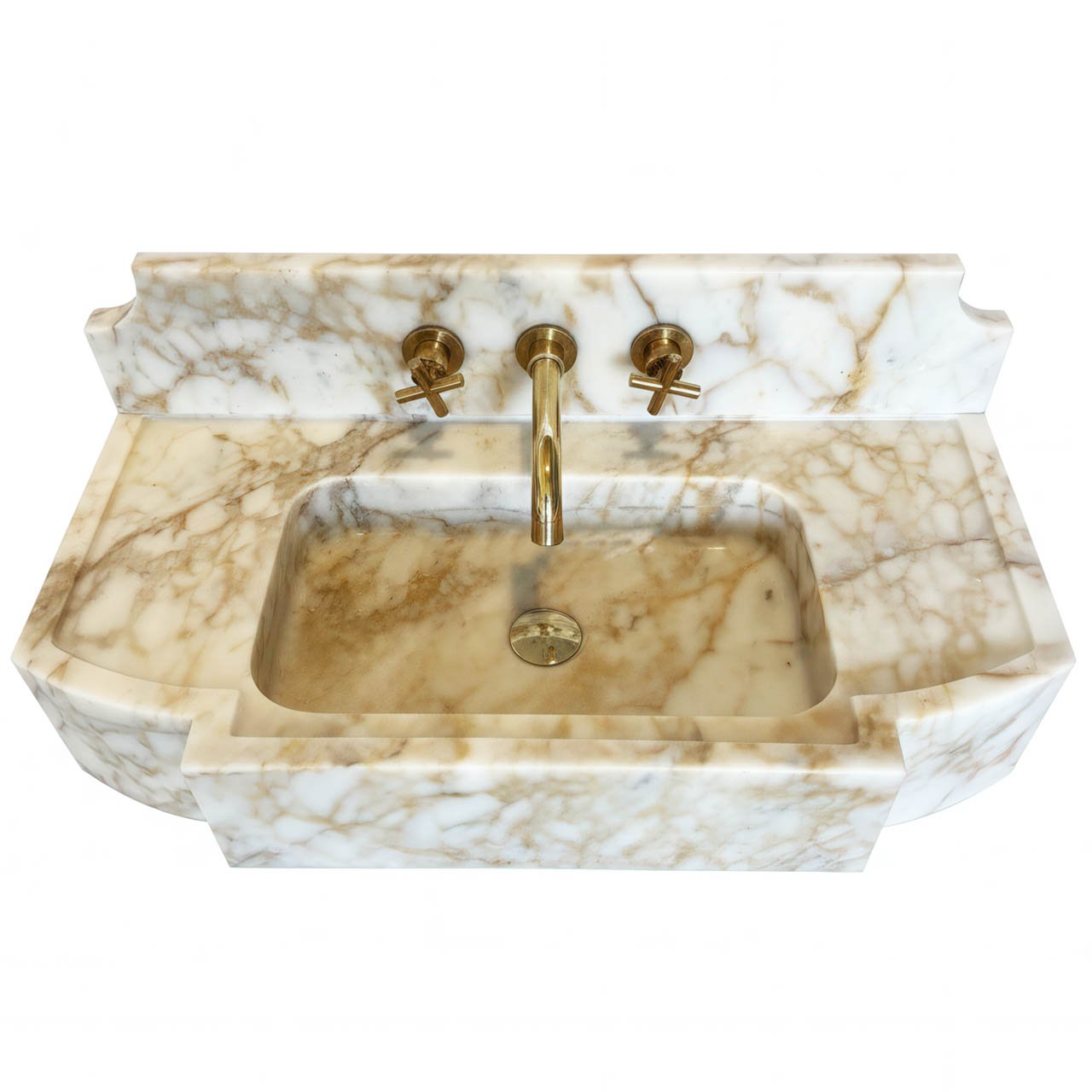 Vintage Hardware Pairing: As shown, it pairs beautifully with aged brass or gold “cross-handle” wall-mounted faucets, which complement the warm tones in the marble’s veins.